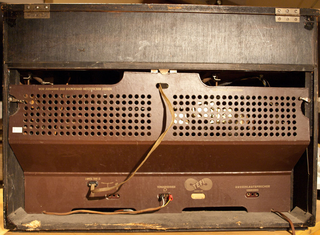 Äußerlich ist nur der Deckel etwas verkratzt, was aber kein Problem darstellt, das Holz ist gut in Schuss, auch der Schallwandstoff sieht sauber aus. Leider fehlt der Tefifon-Schriftzug und beim rechten Abdeckgitter des Hochtöners fehlt ein Steg, aber das sind verschmerzbare Sachen und schmälern meine Freude über dieses schöne Gerät keineswegs.